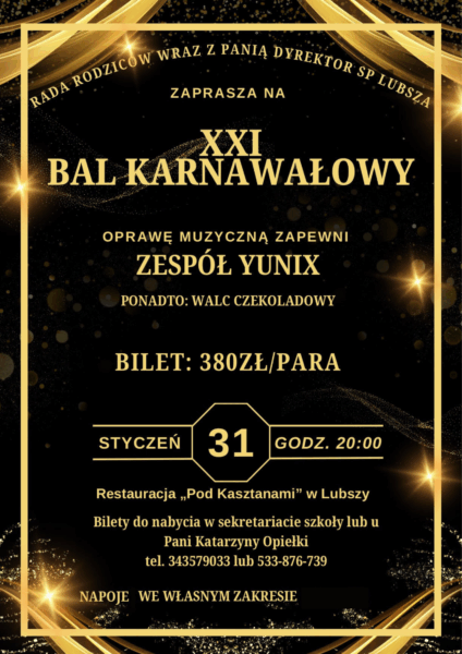 Rada Rodziców przy Szkole Podstawowej im. J. Lompy w Lubszy wraz z Panią Dyrektor zaprasza na XXI Bal Karnawałowy, która odbędzie się 31 stycznia 2026 r. o godz. 20:00 w Restauracji ”Pod Kasztanami” w Lubszy z zespołem „YUNIX”. Koszt 380 zł za parę.