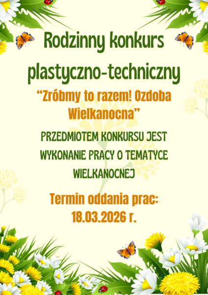 Zachęcamy wszystkich uczniów wraz z rodzinami do wzięcia udziału w Rodzinnym konkursie plastyczno-technicznym „Zróbmy to razem! Ozdoba wielkanocna”, który potrwa do 18 marca 2026 r.