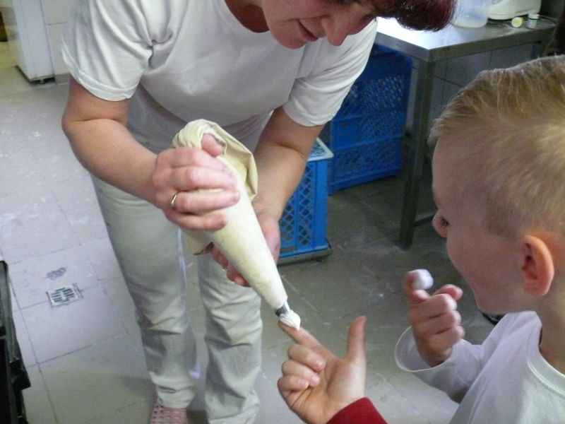 Od początku trwania warsztatów dzieci w grupach czterosobowych zwiedzały piekarnię pod opieką P. Łukasza Majchrzyka,a później cukiernię pod opieką P. Doroty Majchrzyk. W czasie przerwy pracowników i dzieci miały swoją przerwę. W trosce o zdrowie podopiecznych przed kolejnymi punktami warsztatów dzieci zjadły swoje śniadanko.