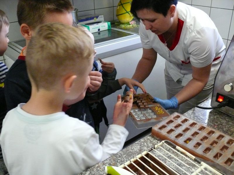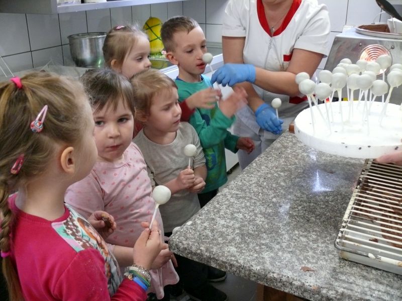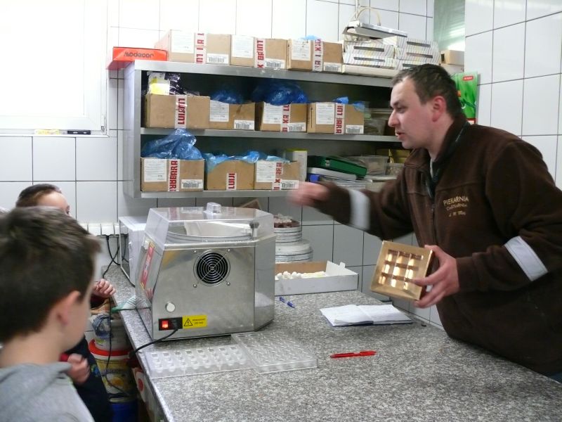 W międzyczasie dzieci w czterosobowych grupach odwiedziły panie cukierniczki gdzie poznały sposób przygotowania pralinek, czekoladek czy lizaków, które można zakupić w sklepach firmowych.