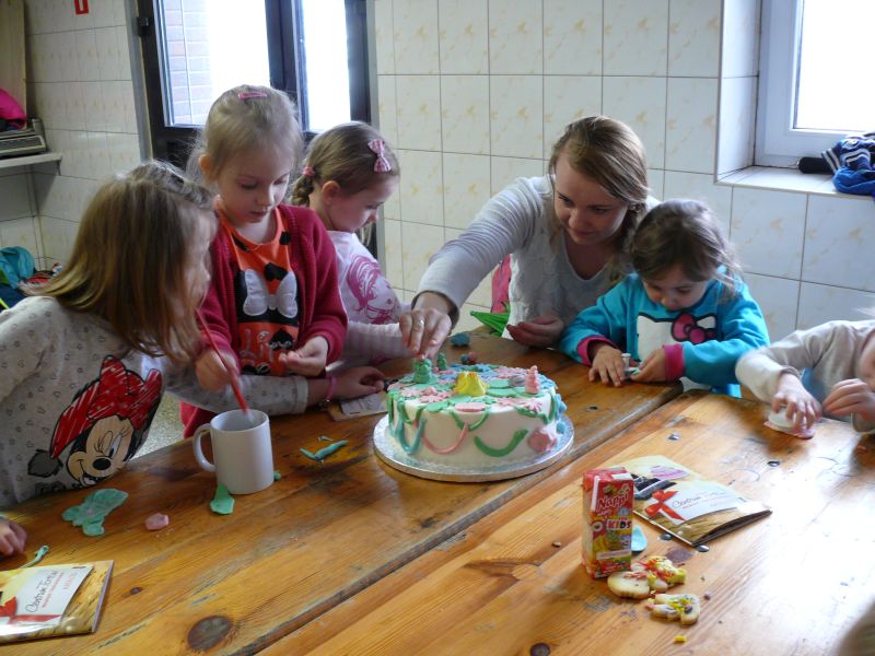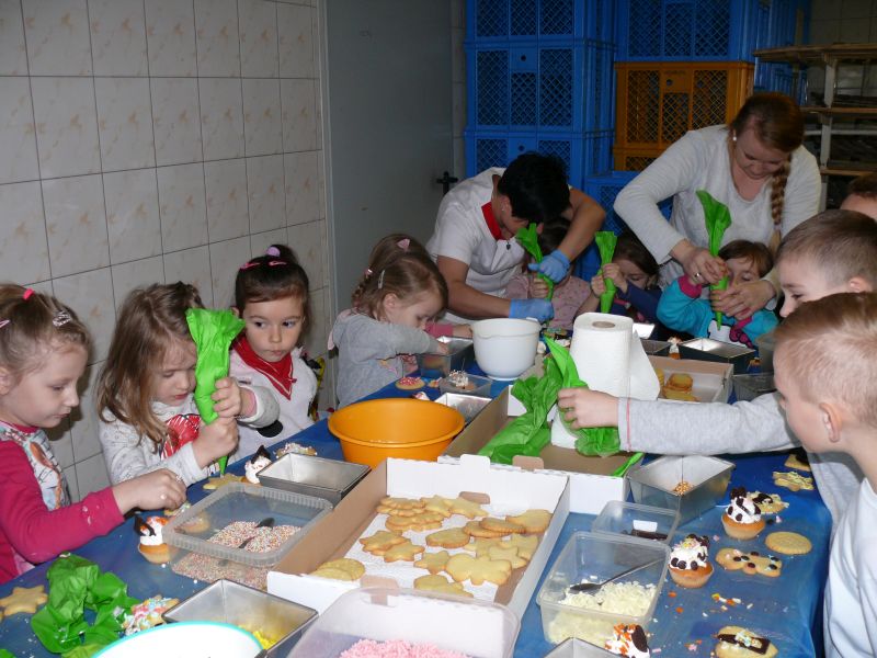 Spotkanie rozpoczęło się od warsztatów cukierniczych. Każdy przedszkolaczek otrzymał upieczoną specjalnie na tę okazję babeczkę , którą samodzielnie przyozdobił bitą śmietaną oraz masą kolorowych posypek oraz ozdób czekoladowych.Po babeczkach przyszedł czas na ozdabianie pierniczków – podobnie jak przy babeczkach dzieci miały możliwość skorzystania z posypek, a także kolorowych polew. Wyciskanie kolorowych mas sprawiało dzieciom niebywałą przyjemność, a możliwość kosztowania wszystkiego co znalazło się na stole było świetną zabawą.Po przyozdobieniu pierniczków organizatorzy oraz wychowawczynie spakowali dzieciom słodkości do przygotowanych pojemniczków.
