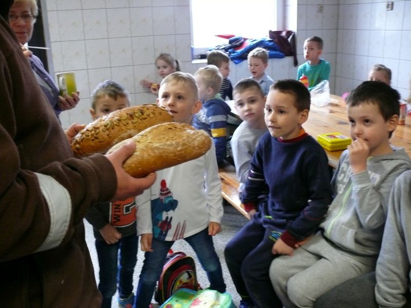 Po krótkiej przerwie kolejnym punktem programu były warsztaty piekarnicze i przygotowanie chleb, dzieci samodzielnie wyrabiały chlebki i wkładały je do foremek.
