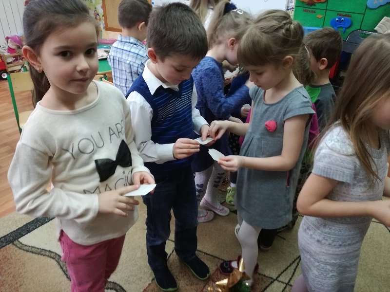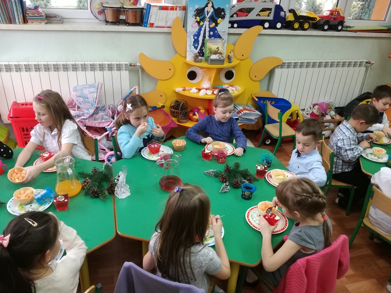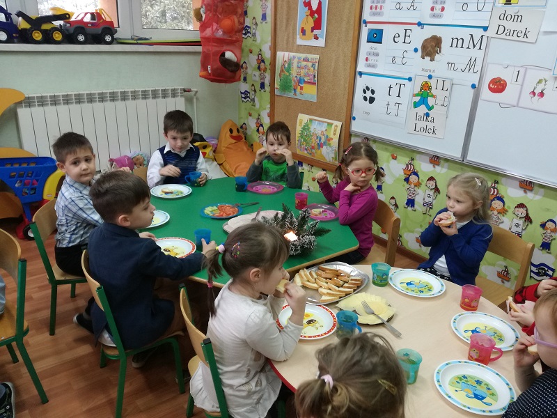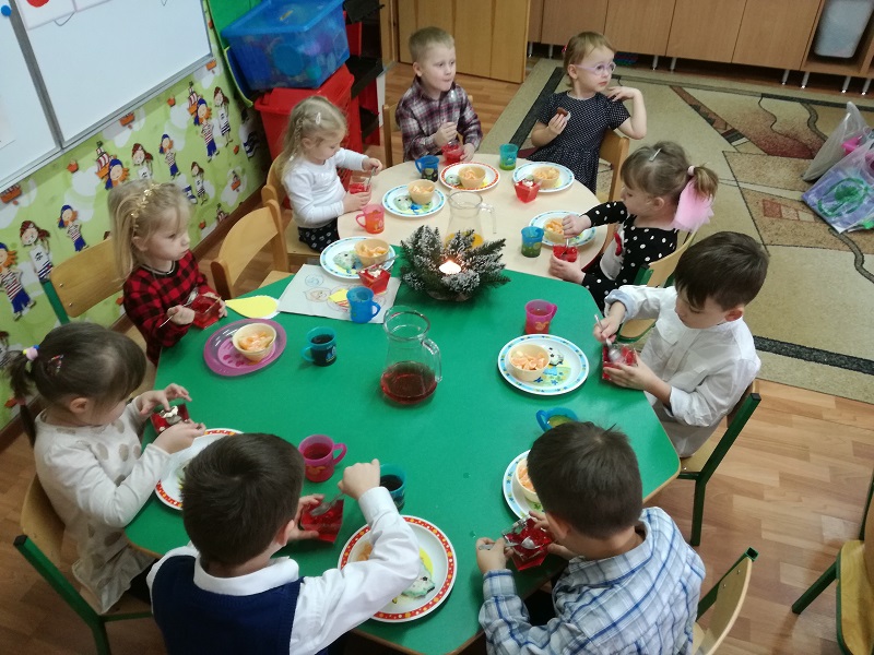 Czas oczekiwania na Święta Bożego Narodzenia w naszym przedszkolu zakończyła wspólna wigilia, która odbyła się 21 grudnia. Dzieci w tym dniu wspólne kolędowały, dzieliły się opłatkiem, składały sobie życzeń oraz zjadły wspólny wigilijny poczęstunek. Oczywiście nie zabrakło prezencików pod lśniącą choinką, które dzieci rozpakowały z wielką radością.