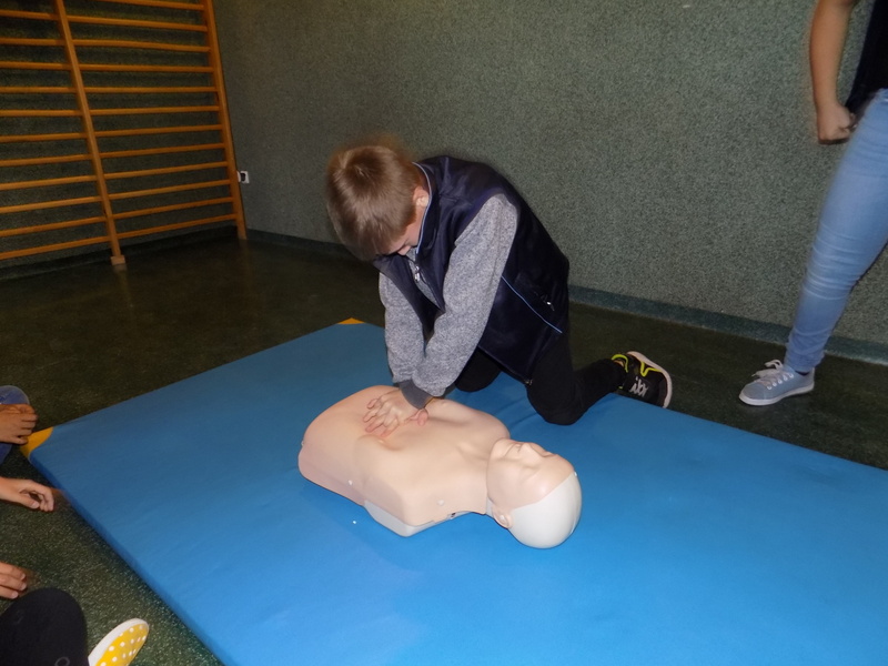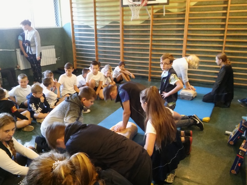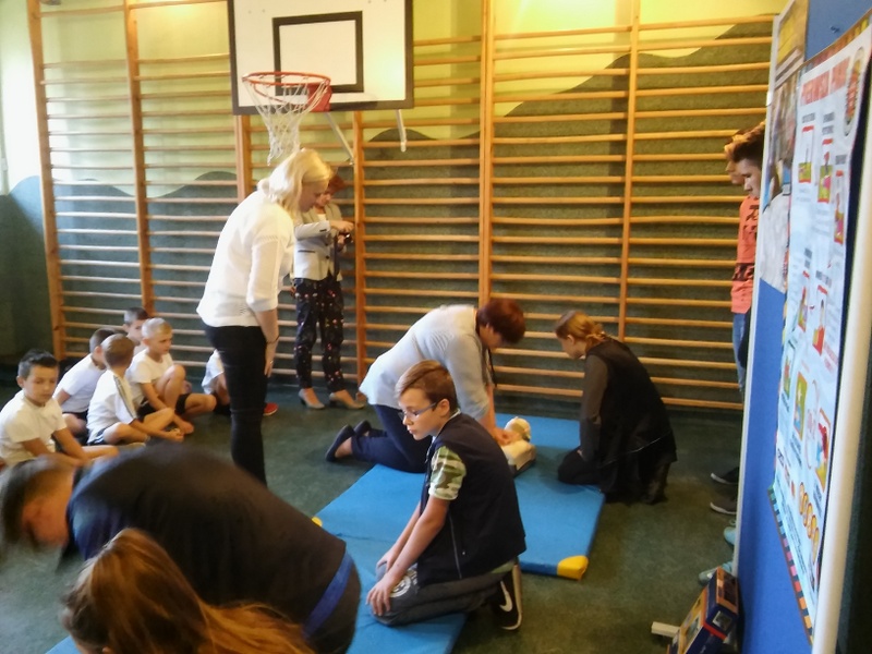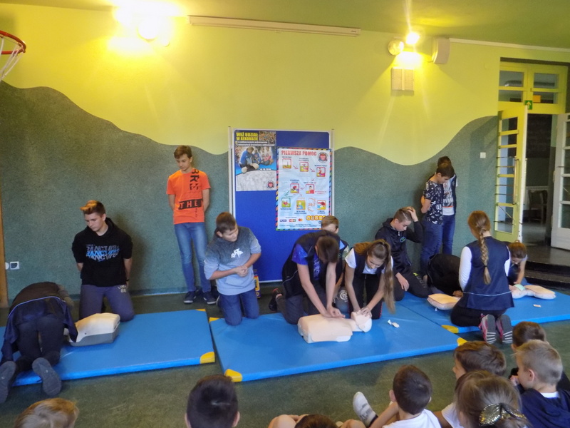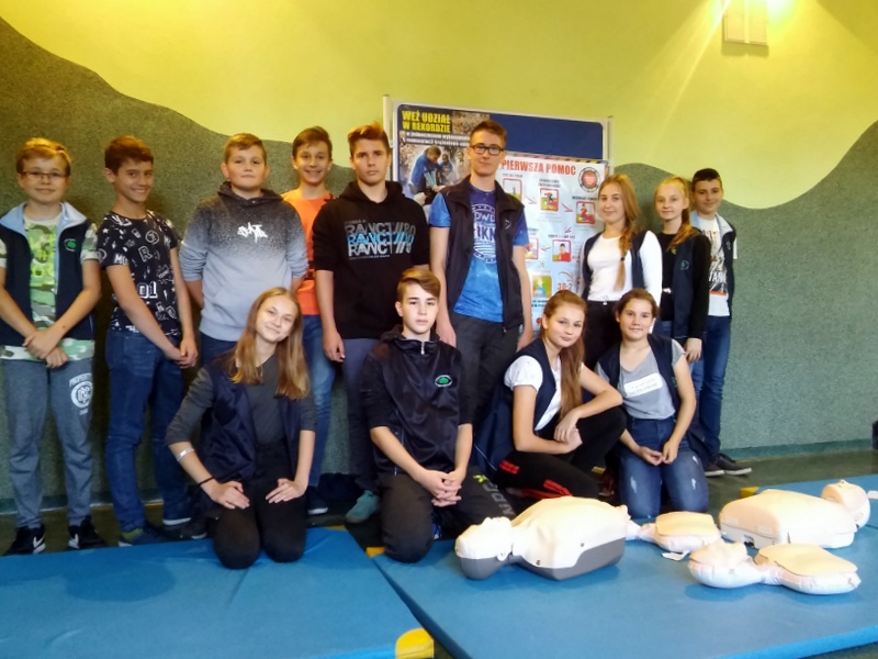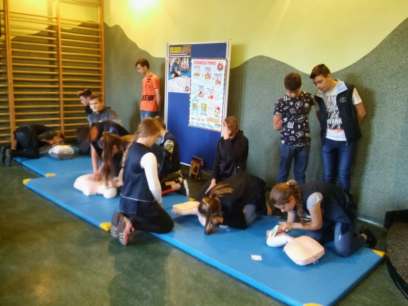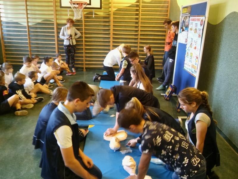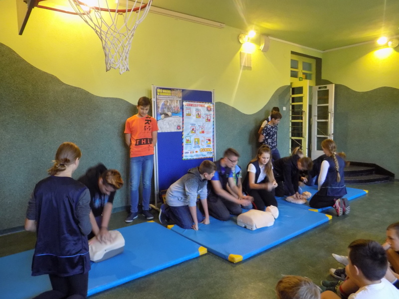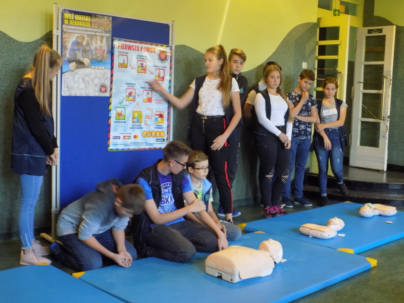 16 października 2018 r. ,z inicjatywy Samorządu Uczniowskiego, uczniowie naszej szkoły wraz z nauczycielami włączyli się w akcję Wielkiej Orkiestry Świątecznej Pomocy, której celem było bicie rekordu w jednoczesnym prowadzeniu resuscytacji krążeniowo-oddechowej. Nadrzędnym celem tej akcji było przeszkolenie jak największej ilości osób w udzielaniu pierwszej pomocy. Akcja trwała 30 minut.Wszyscy uczniowie, którzy przystąpili do bicia rekordu, zostali wcześniej przeszkoleni przez wychowawców bądź nauczyciela edukacji dla bezpieczeństwa, którzy przeprowadzili zajęcia na temat udzielania pierwszej pomocy, pokazali wychowankom filmy instruktażowe i przeprowadzili ćwiczenia praktyczne na fantomach. Dodatkowo, przed przystąpieniem do bicia rekordu, uczennice kl. VIII, działające w Młodzieżowej Ochotniczej Straży Pożarnej, przeprowadziły krótką pogadankę na temat prawidłowego udzielania pierwszej pomocy oraz udzieliły potrzebnych instrukcji swoim młodszym kolegom i koleżankom.