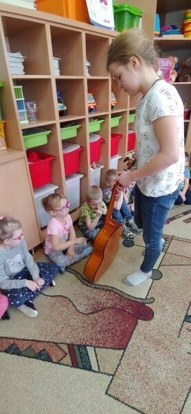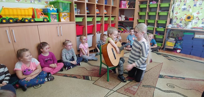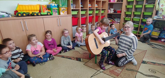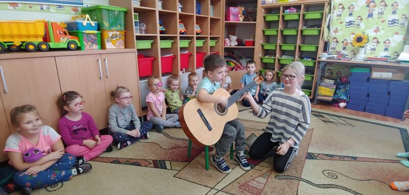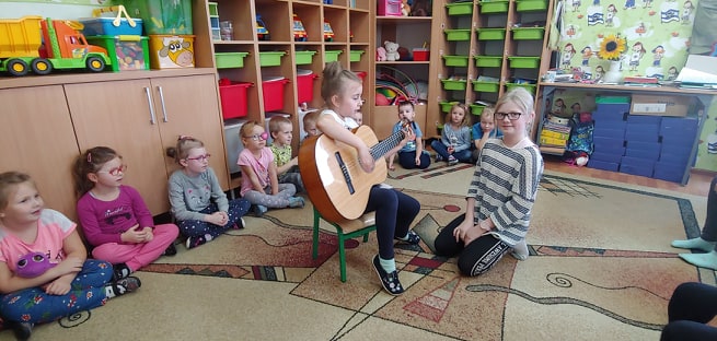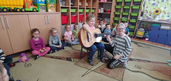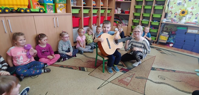 Dzieci były zachwycone mini koncertem, po którym mogły same spróbować zagrać na gitarze, poznały również budowę gitary. Wprowadzając tą innowację w przedszkolu mamy nadzieje, że obudziliśmy choć u paru przedszkolaków chęć do nauki gry na tym instrumencie.