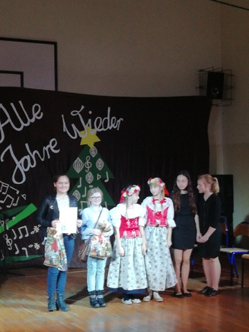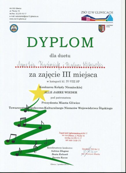 Sukces uczennic naszej szkoły w Konkursie Kolędy Niemieckiej ALLE JAHRE WIEDER w Gliwicach!7 grudnia 2018 roku trzy uczennice naszej szkoły wzięły udział w Konkursie Kolędy Niemieckiej w Gliwicach. Olivia Filipczyk, Amelia Kuźniak i Paulina Witkowska wspaniale reprezentowały naszą szkołę. Uczennice zaśpiewały piosenki bożonarodzeniowe po niemiecku. Mimo ogromnej konkurencji Amelia i Paulina w duecie wyśpiewały 3 miejsce. Uczennice otrzymały dyplom oraz nagrody rzeczowe. Serdecznie im gratulujemy!