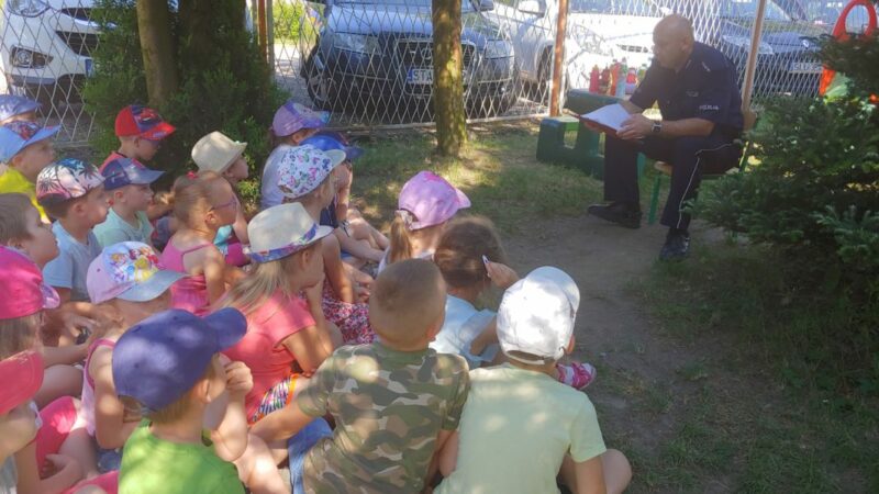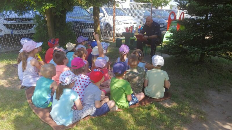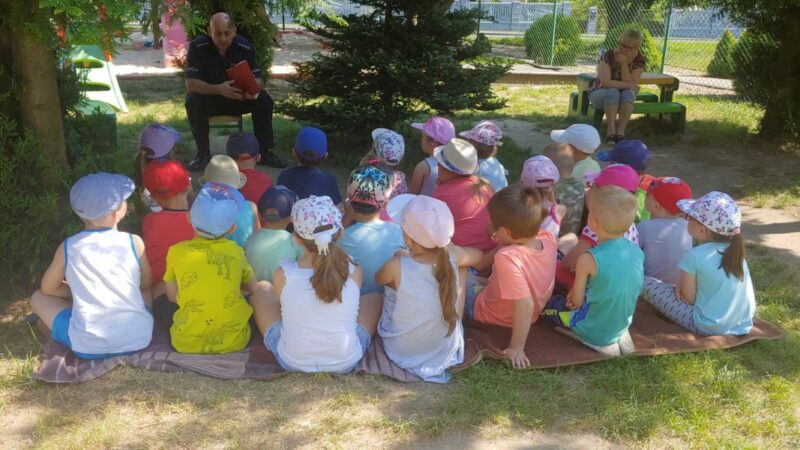Do przedszkola zawitał Pan Policjant i przeprowadził z dziećmi pogadankę na temat bezpiecznych wakacji. Policjant poruszył bardzo ważne tematy, jak zachować się podczas niebezpiecznych sytuacji w trakcie wakacji i nie tylko. Zwrócił dzieciom uwagę, aby nie podchodzili do obcych psów, aby nie przyjmowali podarunków od obcych osób i nie wsiadali do obcych samochodów, aby nie otwierali drzwi nieznajomym, alby nie oddalały się dzieci od swoich rodziców. Przypomniał zasady bezpiecznego poruszania sie po jezdni, pasach na przejściu dla pieszych.