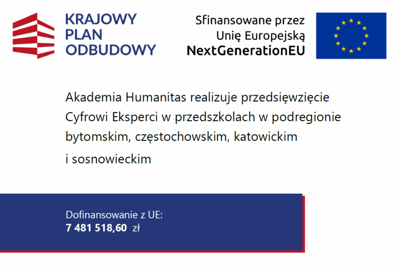 Akademia Humanitas wraz z Fundacją Silesia Nobiluim w okresie 1 września 2024 r. do 31 maja 2025 r. realizuje projekt „Cyfrowi Eksperci w przedszkolach w podregionie bytomskim, częstochowskim, katowickim i sosnowieckim” nr KPOD.05.08-IW.06-0055/24 dofinansowany przez Unię Europejską w ramach Krajowy Plan Odbudowy i Zwiększenia Odporności (KPO) – Szkolenia dla nauczycieli wychowania przedszkolnego.