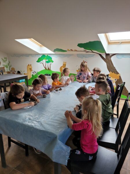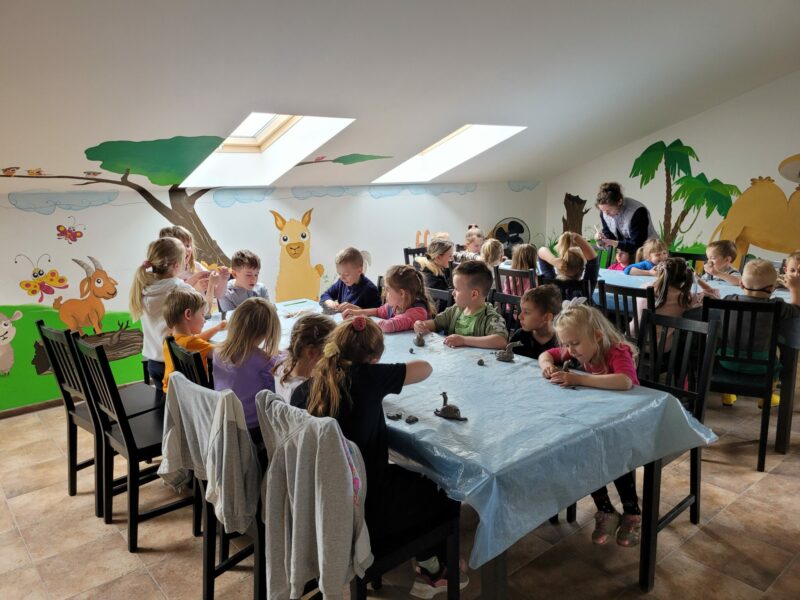 Kolejnym punktem programu były warsztaty na których dzieci samodzielnie ulepiły z gliny alpaki. Wycieczkę zakończyliśmy zjedzeniem pysznych kiełbasek z ogniska i zabawą na placu zabaw. Mimo chłodnej pogody, świeże powietrze i wspaniała zabawa, sprawiły, że przedszkolaki bawiły się świetnie. Wszyscy zadowoleni wróciliśmy do przedszkola.