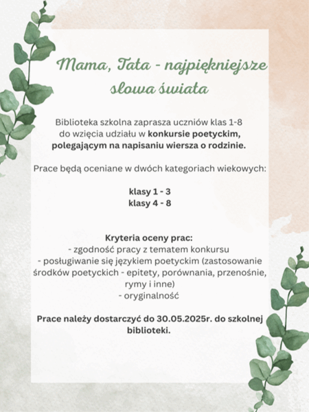 Biblioteka szkolna zaprasza uczniów klas 1-8 do wzięcia udziału w konkursie poetyckim, polegającym na napisaniu wiersza o rodzinie.