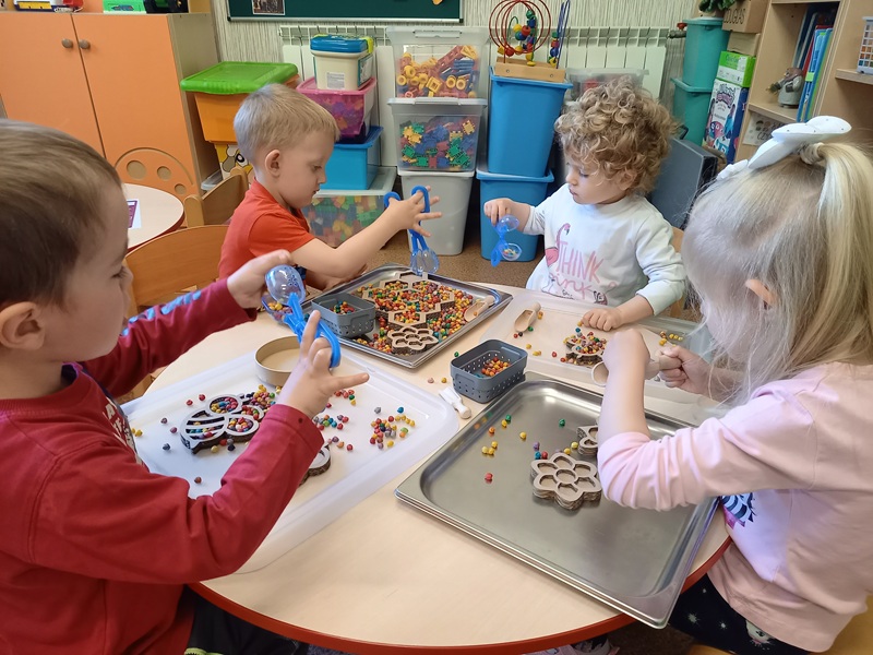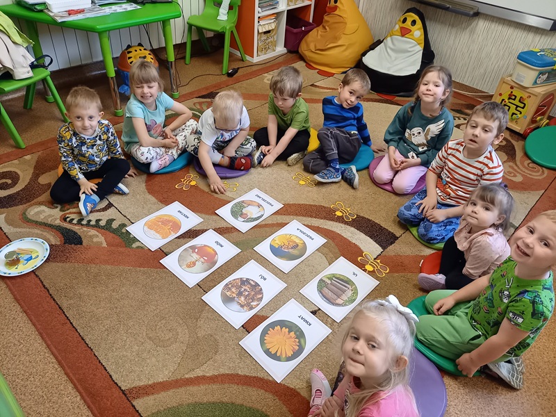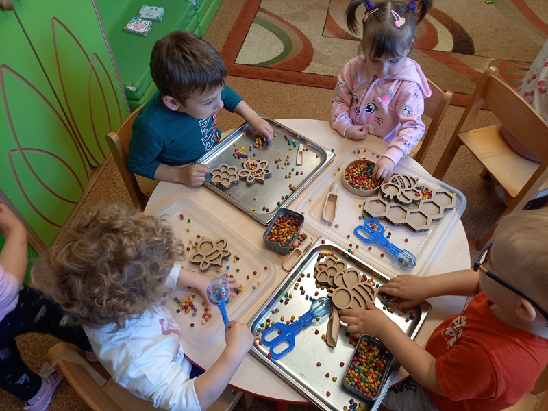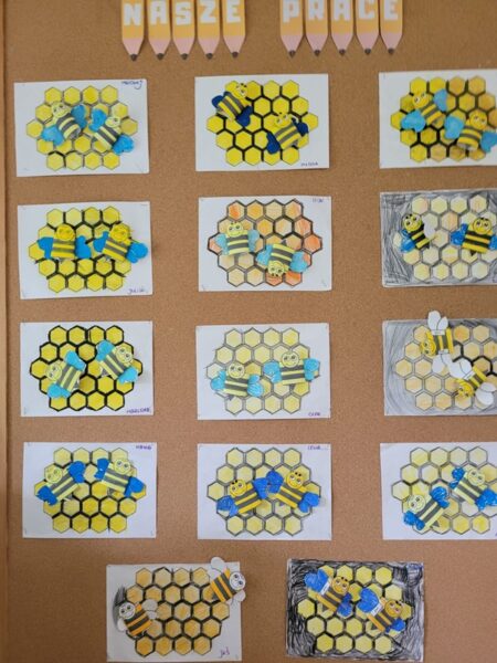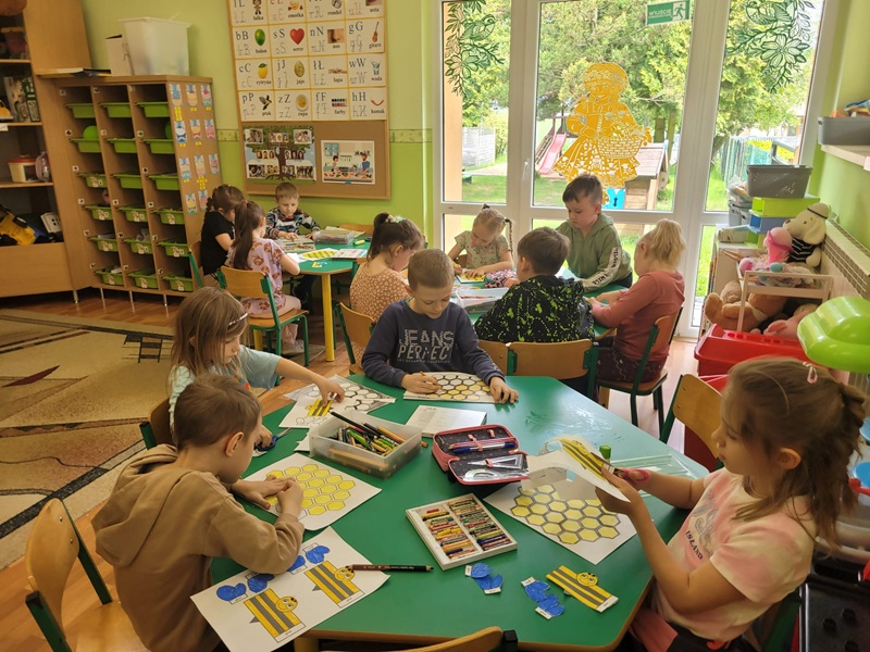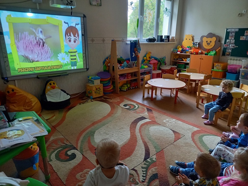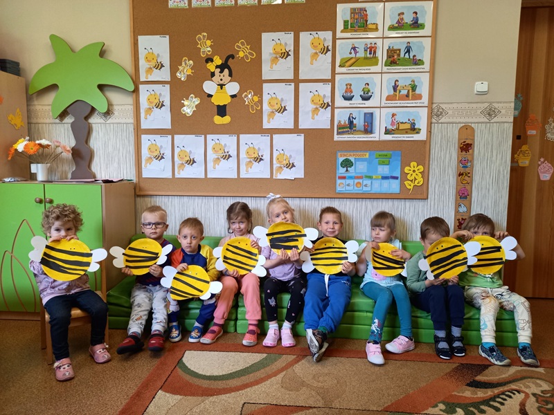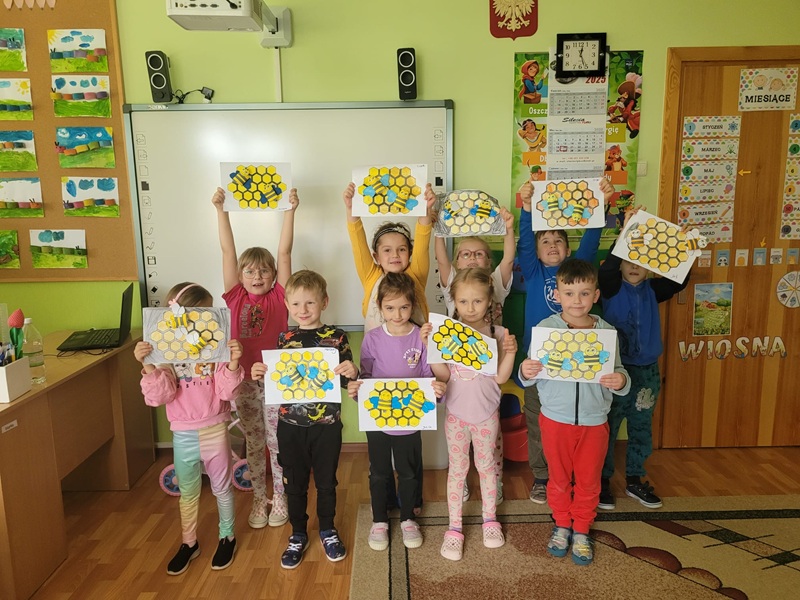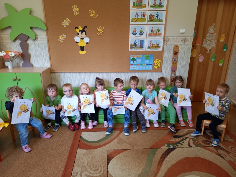 Dzieci wysłuchały „ Bajki o pszczółce Hani”, miały okazję spróbować miodu, poznać cykl życia pszczoły, dowiedzieć się czym jest zapylanie kwiatów i dlaczego pszczoły są zagrożone wyginięciem. Na zajęciach dzieci dowiedziały się jak można pomóc pszczołom. Przedszkolaki wykonały ciekawe prace plastyczne, nie zabrakło również zabaw ruchowych przy piosenkach „Taniec Mai” i „Pszczółka Maja”.