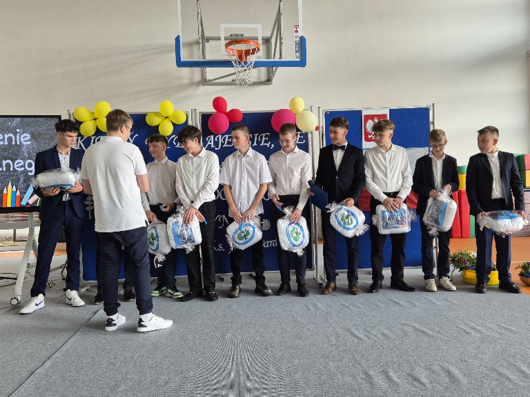 Uczniowie klasy ósmej pożegnali swoich nauczycieli, pracowników szkoły, a także kolegów i koleżanki z młodszych oddziałów. Podziękowali za pasję, opiekę i nauczanie. Wkrótce rozpoczną naukę w szkołach ponadpodstawowych i będą stawiać czoła nowym doświadczeniom. Zostawili cząstkę siebie w murach naszej szkoły, ale też w ich sercach pozostała „podstawówka”. Na pamiątkę otrzymali albumy ze zdjęciami, a także poduszki i breloczki od klasy 7. Najlepszy uczeń z klasy 8 otrzymała nagrodę książkową od Burmistrza Woźnik, którą w jego imieniu wręczyła Pani Sekretarz Miasta Magdalena Jarosz-Wawrzyńczak.