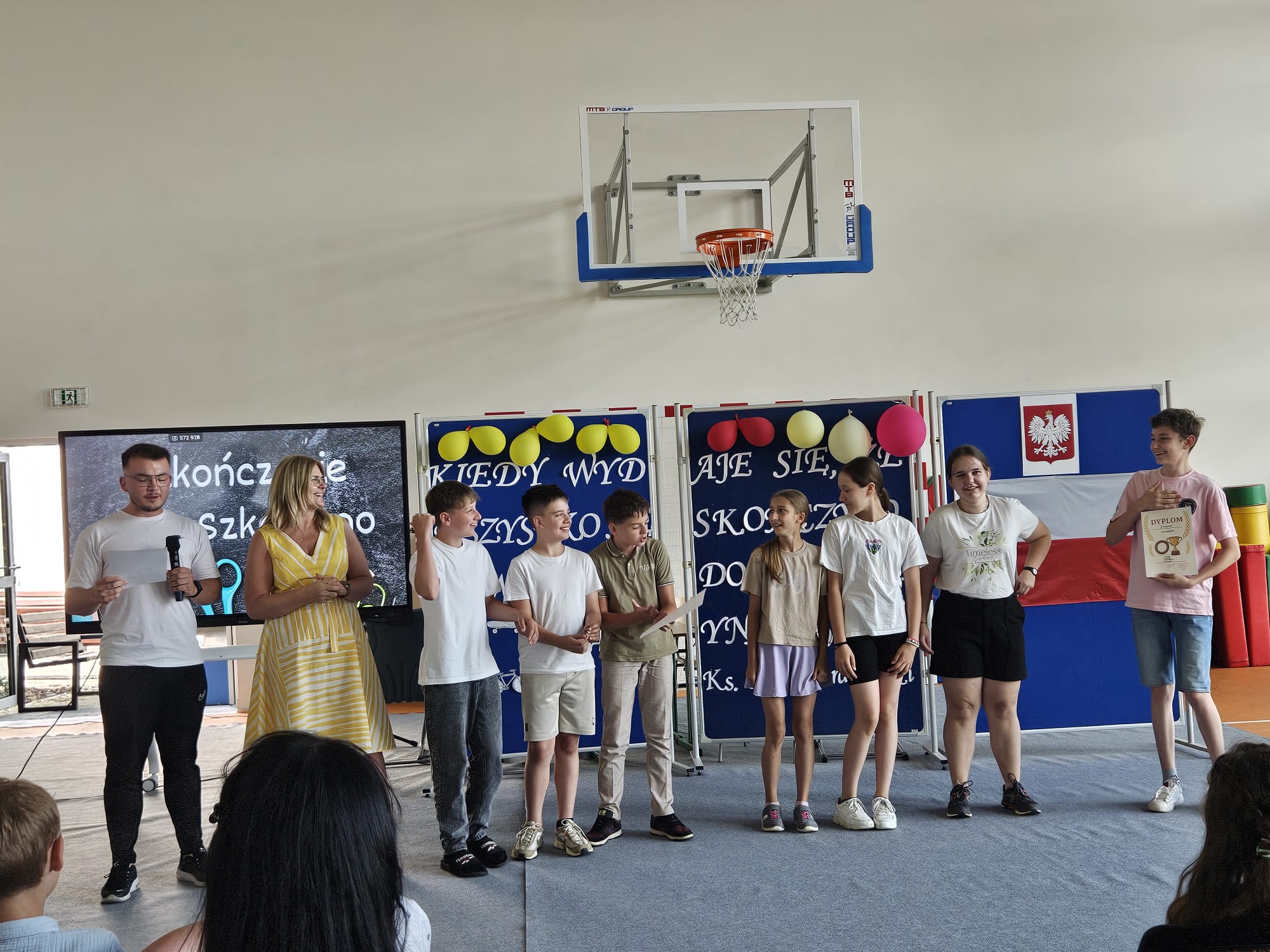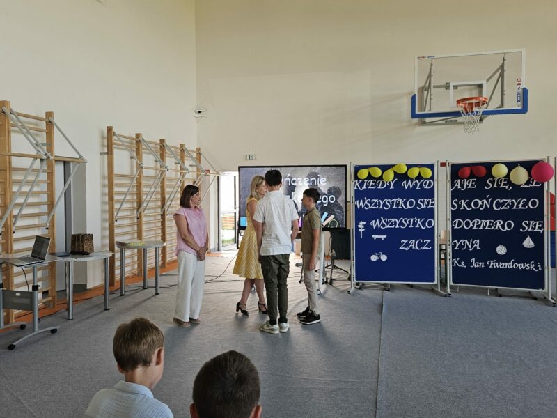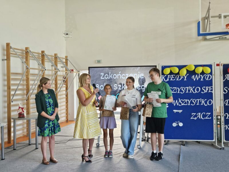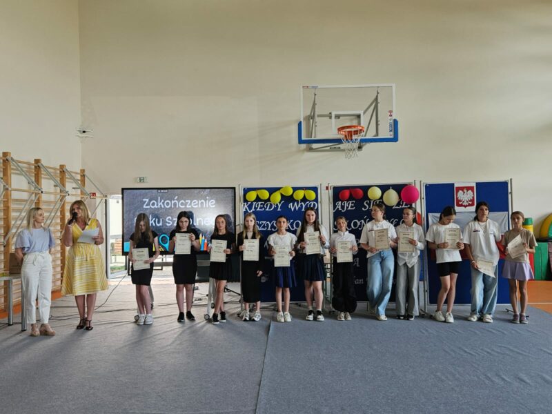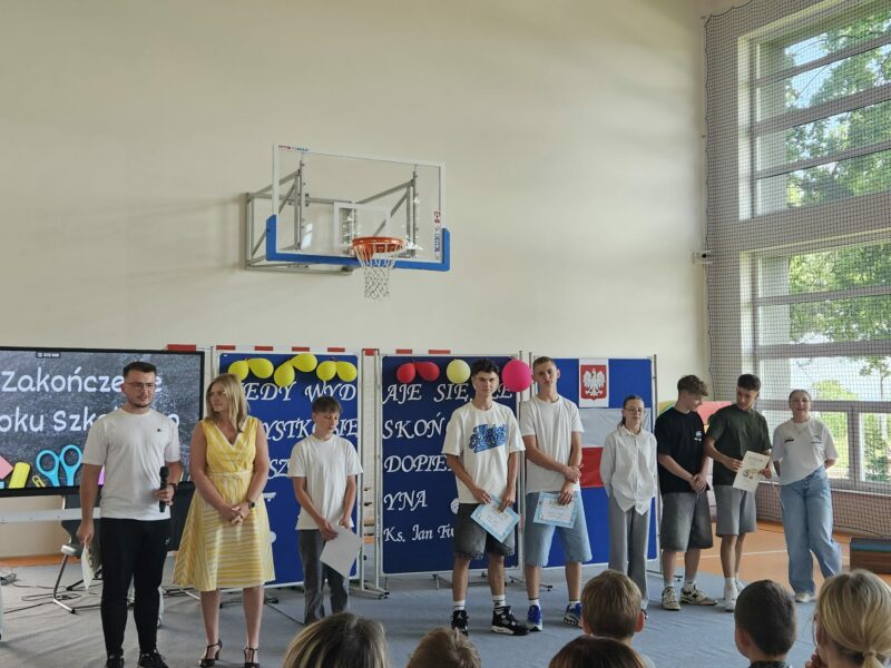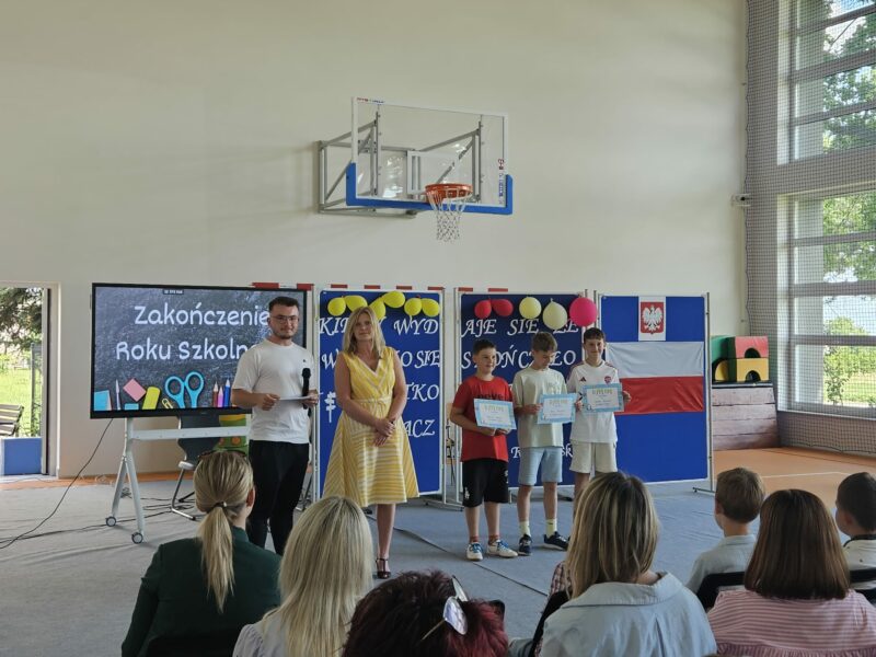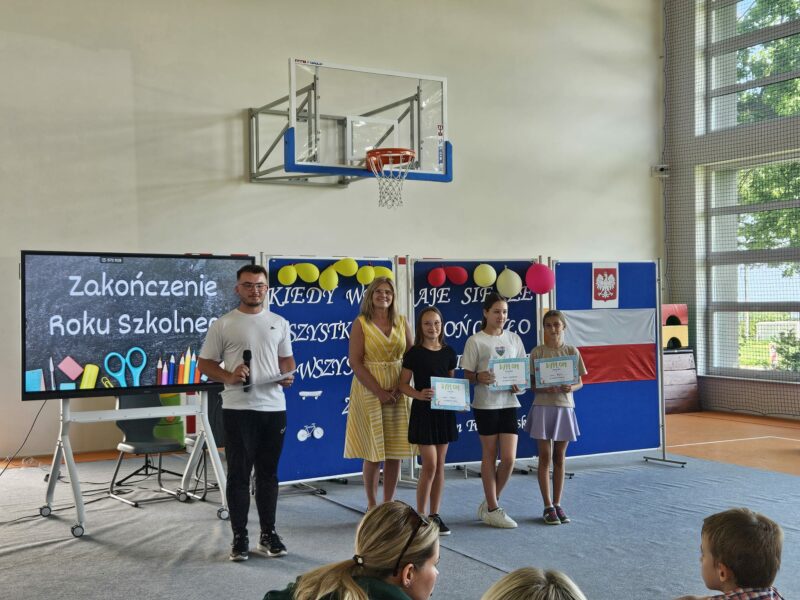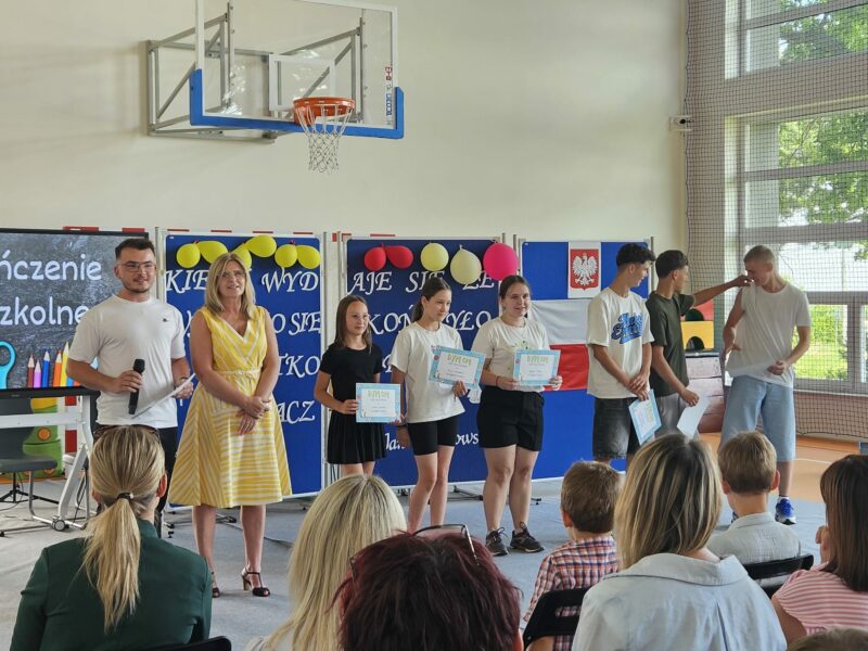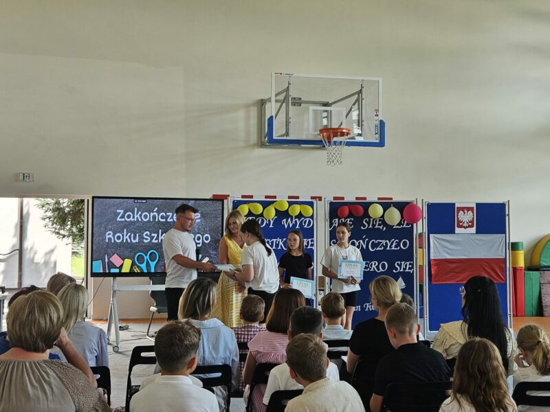 Ostatni czwartek roku szkolnego był czasem podsumowań konkursów szkolnych, egzaminów na kartę rowerową i osobistych osiągnięć uczniów. 26 czerwca 2025 r. na sali gimnastycznej uroczyście wręczono dyplomy, podziękowania i karty rowerowe.