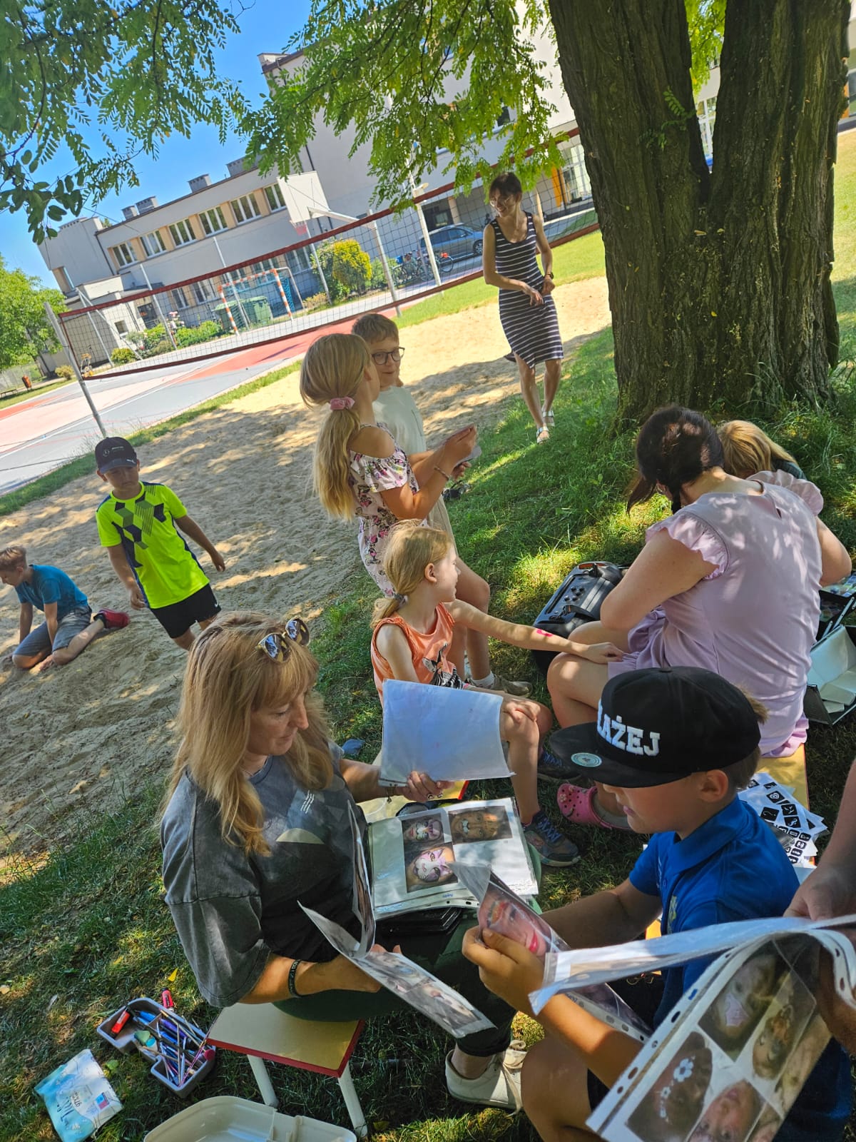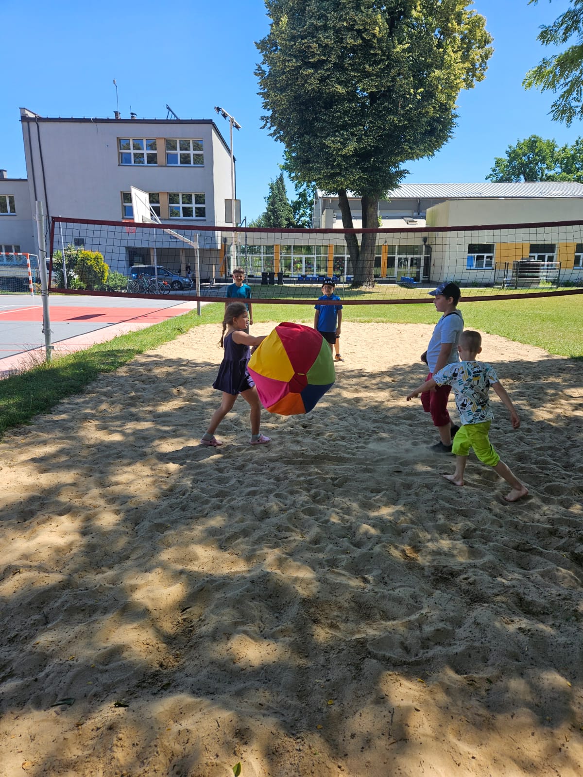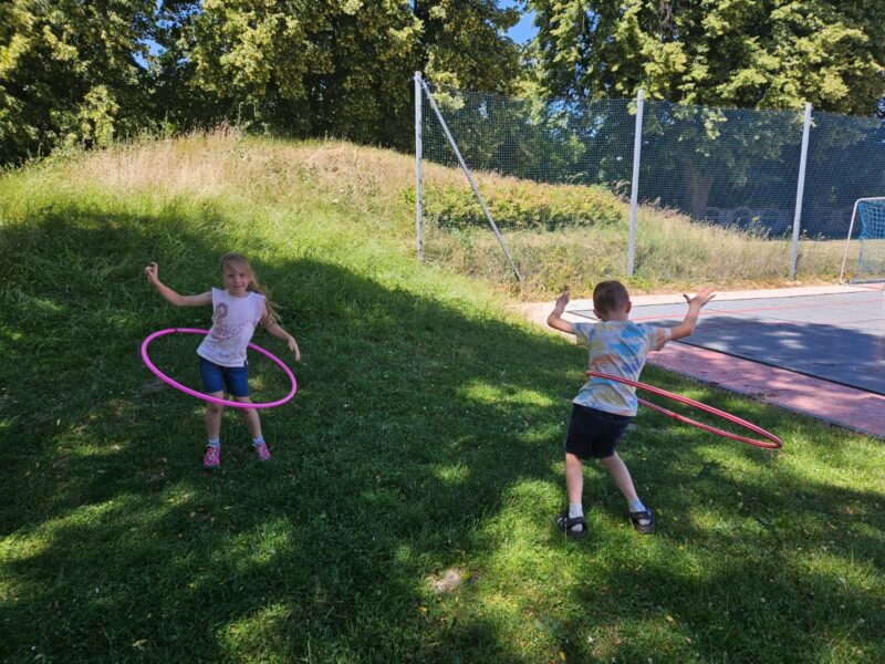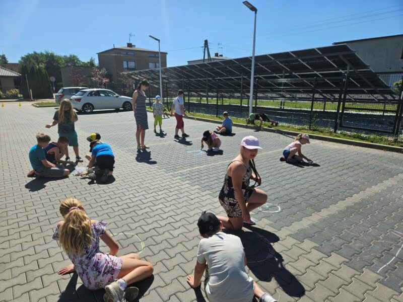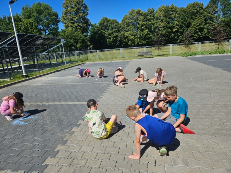 Wspólnie powtórzyliśmy zasady bezpiecznego korzystania z dróg publicznych – okazało się, że wszyscy doskonale znamy przepisy drogowe i rozpoznajemy najważniejsze znaki. Aby ich nie zapomnieć wykorzystaliśmy kredę i narysowaliśmy ich podobizny na parkingu przy szkole. Po godzinnie 11 ponownie odwiedziły nas Panie z Miejsko-Gminnego Ośrodka Kultury, z którymi dziś przyjechały do nas Frelki! Panie z koła gospodyń przygotowały dla nas watę cukrową i gofry. Nie moglibyśmy być szczęśliwsi! Zabawie na świeżym powietrzu nie było końca, szczególnym zainteresowaniem cieszyło się przeciąganie liny, skakanka i wielka piłka plażowa.