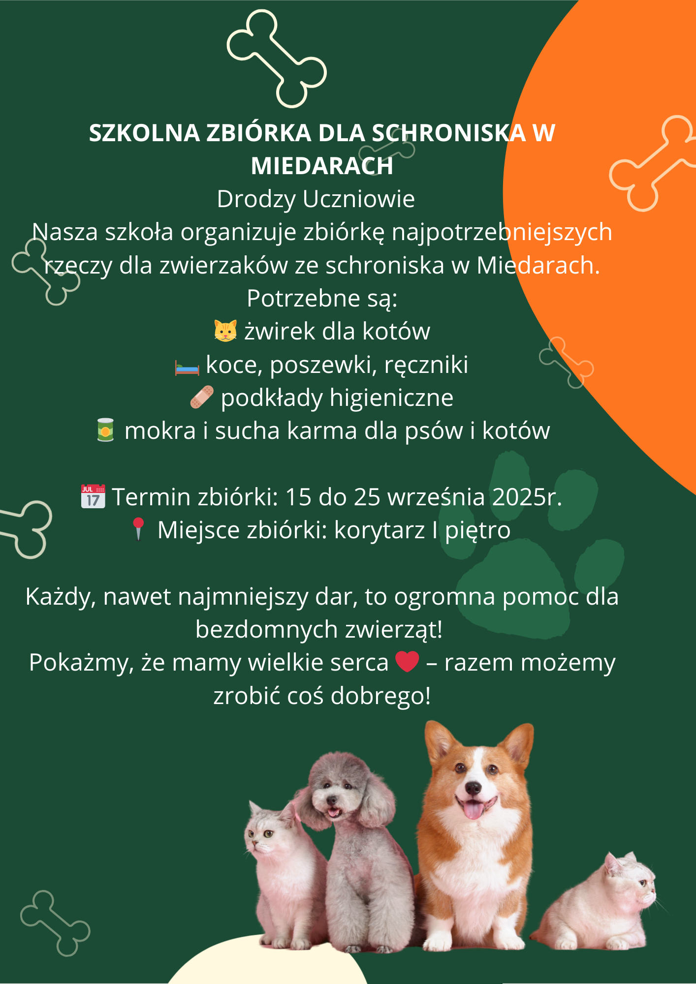 Chcemy pomóc zwierzakom z schroniska w Miedarach, dlatego organizujemy szkolną zbiórkę najpotrzebniejszych rzeczy.