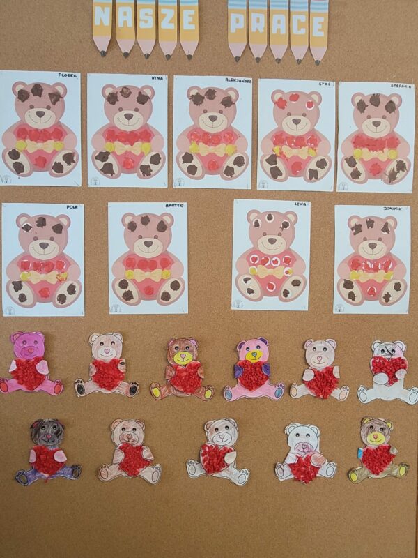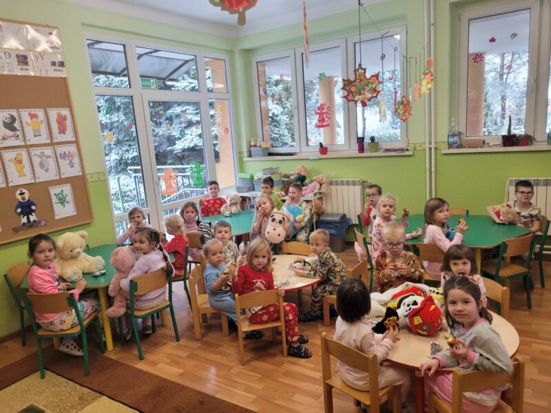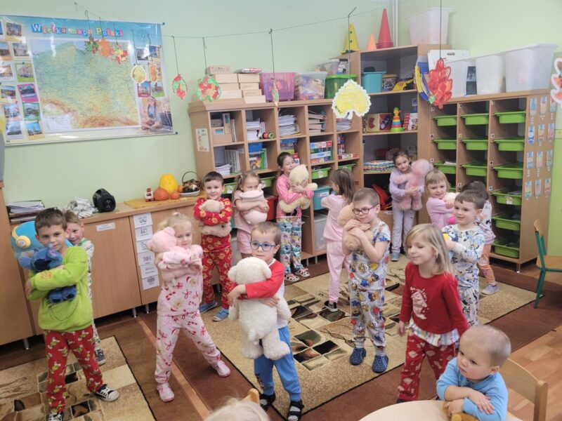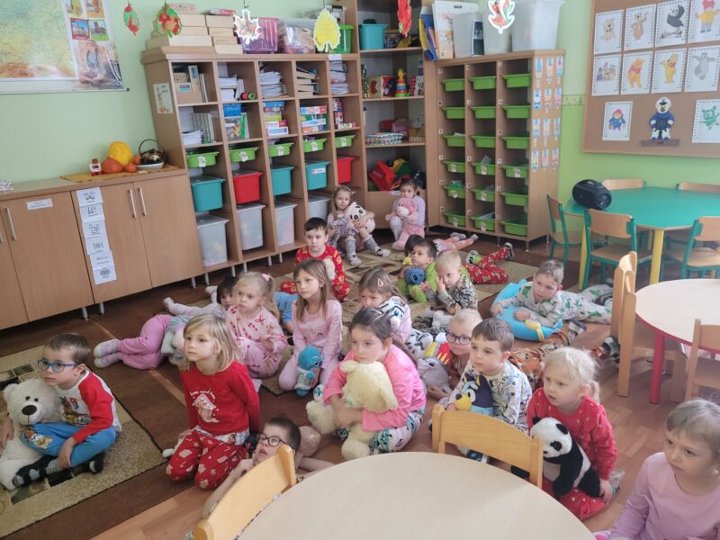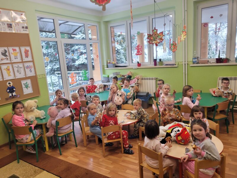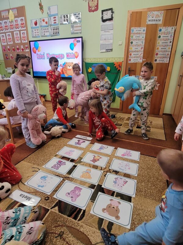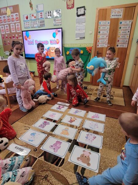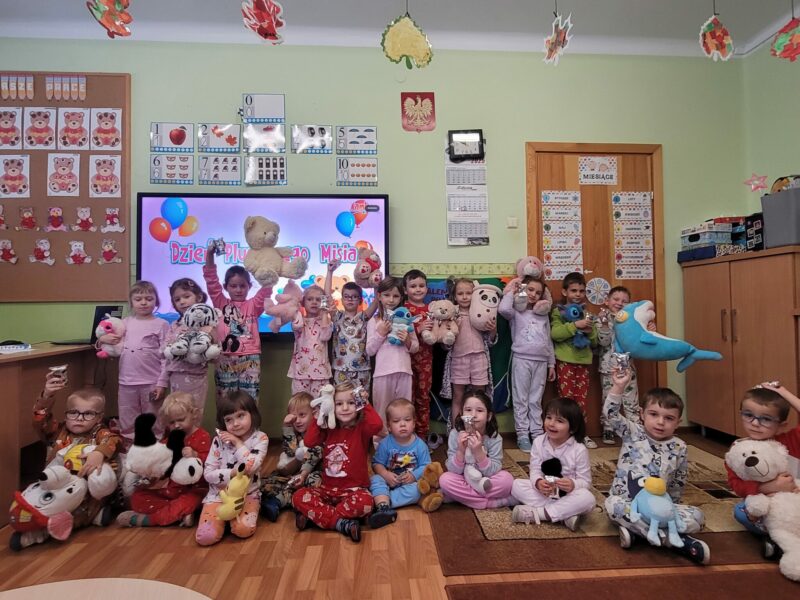 25 listopada swoje święto obchodzi Pluszowy Miś – najmilsza zabawka, najlepszy przyjaciel dzieci i niezastąpiona przytulanka przy zasypianiu. W naszym przedszkolu Święto Pluszowego Misia obchodzone jest bardzo szczególnie. Tego dnia, każde dziecko przyszło do przedszkola w piżamce ze swoim „milutkim” przyjacielem, by wspólnie z innymi celebrować te pełne radości chwile. Na dzieci i ich misie czekało wiele atrakcji. Poznały historię święta, bawiły się przy misiowych piosenkach, uczestniczyły w zabawach ruchowych i zręcznościowych. Nie zabrakło konkursów, quizów i zgadywanek o słynnych misiach występujących w znanych bajkach oraz misiowych breloczków. Przedszkolaki również wykonały przepiękne prace plastyczne z misiem w roli głównej. Dzieci mogły również skosztować pysznego przysmaku- misiowych ciasteczek.