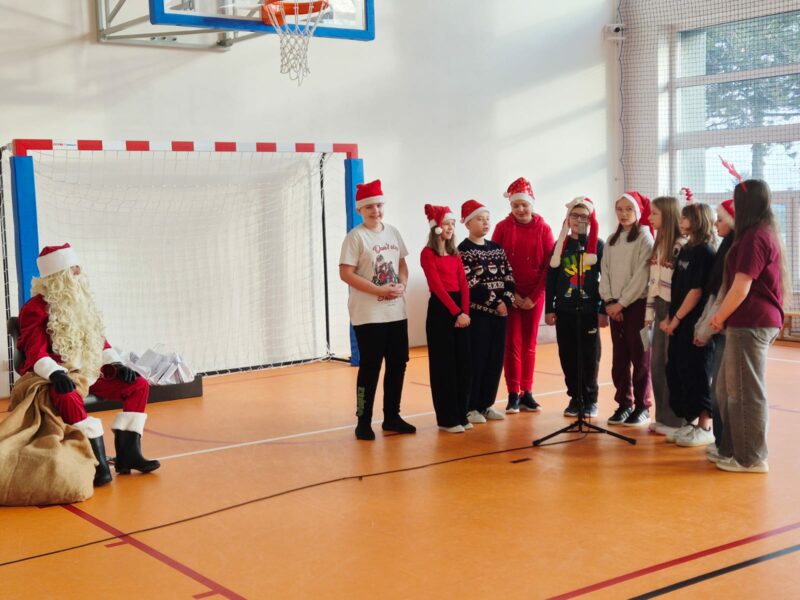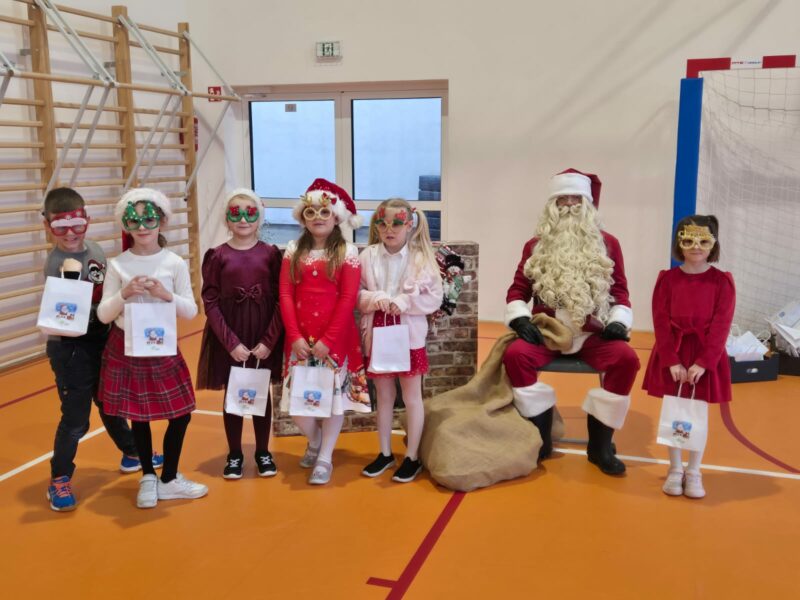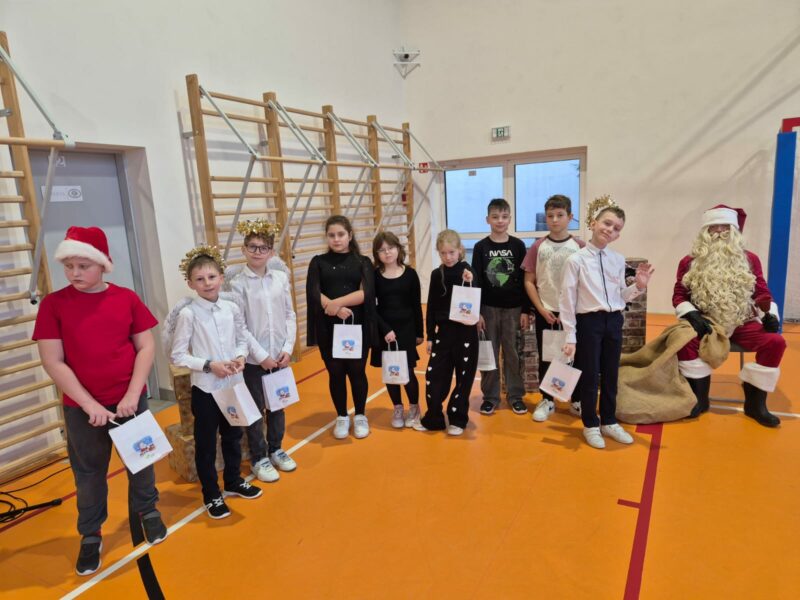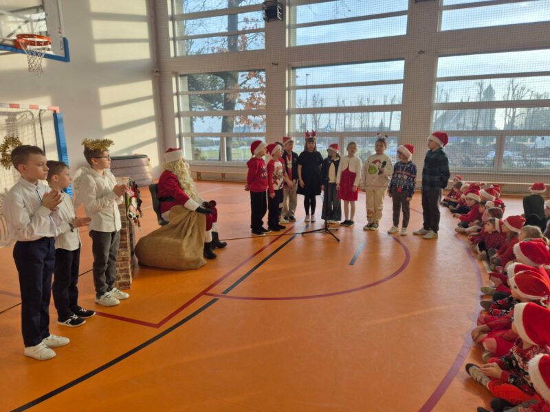 Nadszedł wreszcie długo oczekiwany dzień . Wszystkie dzieci z wielką niecierpliwością spoglądały na drzwi i nasłuchiwały „Mikołajowych” dzwoneczków. Święty Mikołaj nie zawiódł dzieci i nie kazał długo na siebie czekać. Już od samego rana zawitał do naszej szkoły. Uczniowi z zaangażowaniem wystąpili przed Mikołajem z piosenkami, wierszykami i przedstawieniem. Po zakończeniu nasz Gość obdarował dzieci prezentami. Wręczając prezenty nie szczędził ciepłych słów pod adresem dzieci. Uczniowie robili sobie z Mikołajem wspólne pamiątkowe zdjęcia. Mikołaj życzył dzieciom wiele radości i dużo dobrych ocen. Jeżeli będą grzeczni – to za rok znowu pojawi się w naszej szkole.