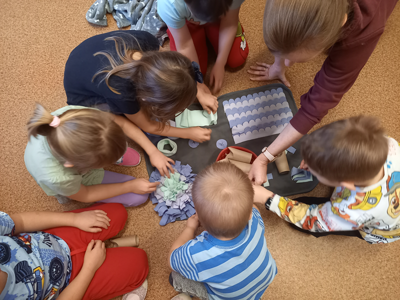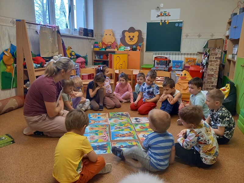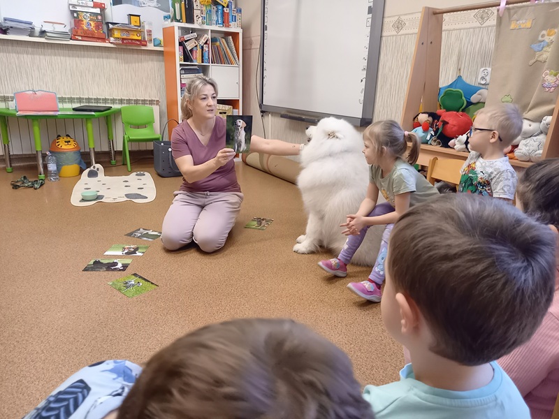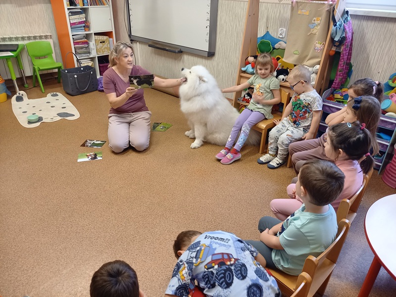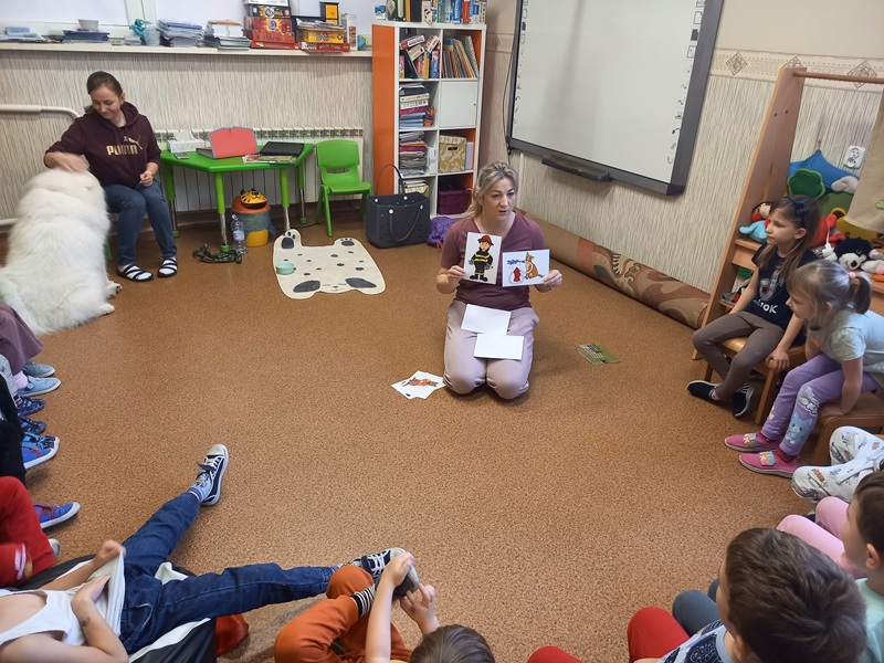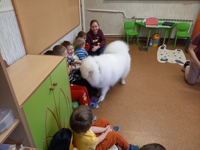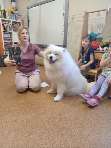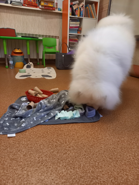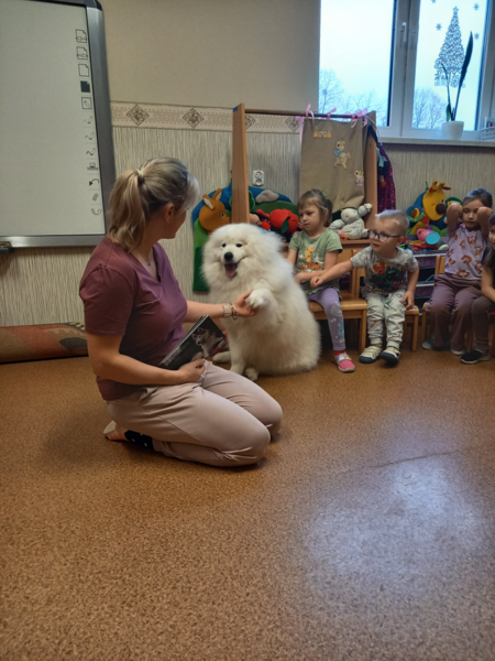 W trakcie zajęć dzieci poznały różne rasy psów, dowiedziały się jakie zawody mogą wykonywać psy. Przedszkolaki przypomniały sobie gdzie można psa głaskać, a gdzie nie powinniśmy go dotykać. Dzieci miały okazję ukryć w specjalnej macie smaczki dla Lumi. Zajęcia ponownie wywołały mnóstwo radości i emocji, a dzieci z zaangażowaniem uczestniczyły w wszystkich zabawach. Dziękujemy Lumi i pani Marcie za kolejną wizytę :)