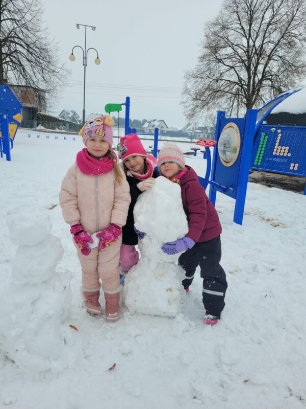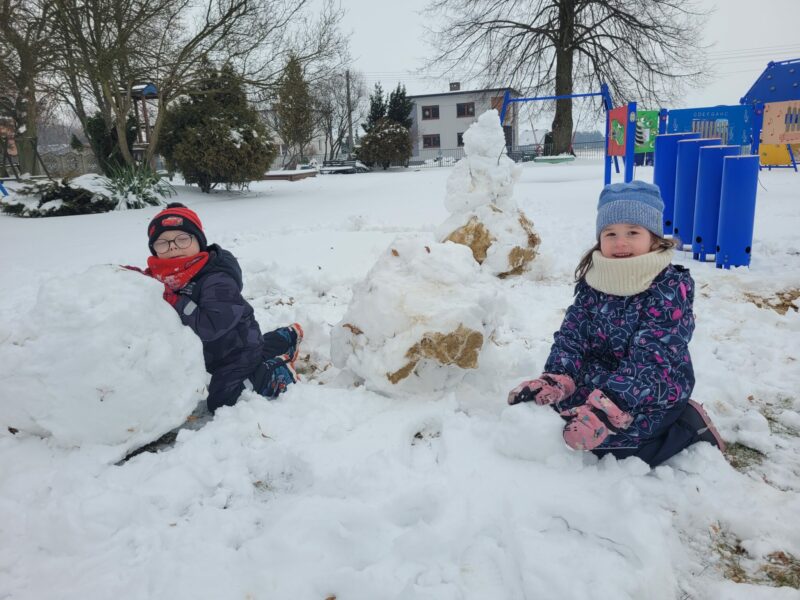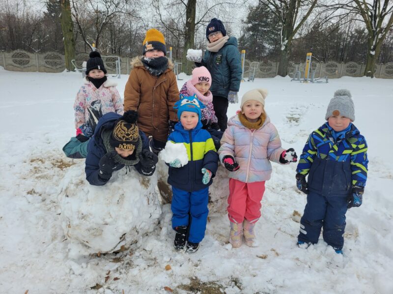 W ostatnim czasie wyjścia na świeże powietrze urozmaicało przyjście prawdziwej zimy. Był mrozik i śnieżek. Przedszkolaki cieszyły się z tego rzadkiego widoku. Biały puszek pozwolił na zabawy w ogrodzie szkolnym. Dzieci rzucały się śnieżkami, lepiły bałwanki, robiły orzełki, turlały się po śniegu, chodziły po swoich śladach, a uśmiechy nie schodziły im z twarzy.