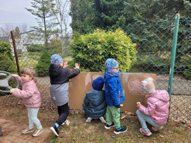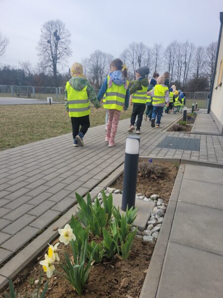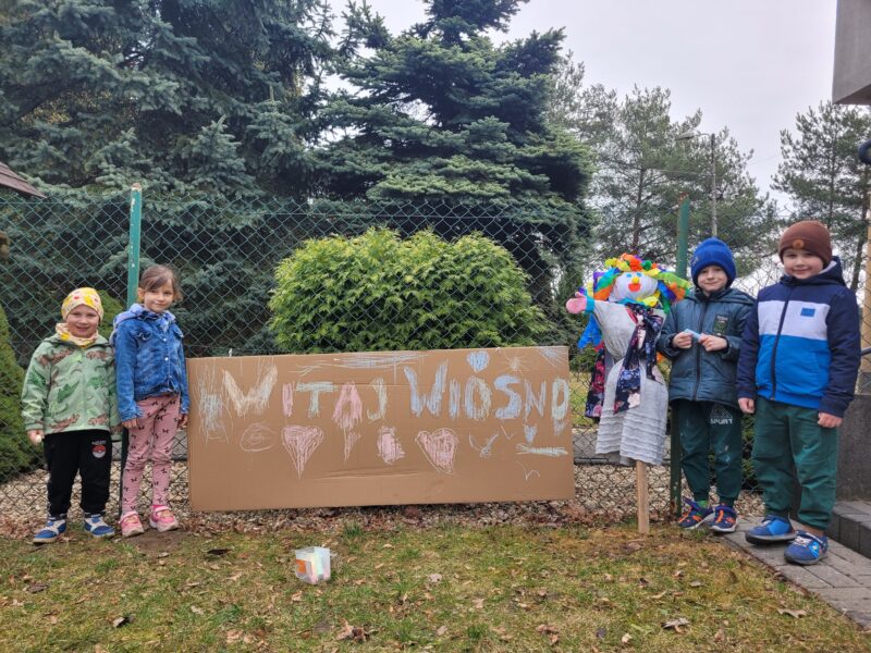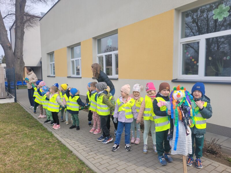 Uśmiechnięci wyruszyliśmy na spacer w okolicy naszego przedszkola, gdzie pożegnaliśmy zimę wraz z Marzanną, a przy okazji poszukać zwiastunów wiosny, o których rozmawialiśmy na zajęciach. Dodatkowo dzieci próbowały odstraszyć zimę, śpiewając głośno piosenki o wiośnie. I tak kolorowy, ale już wiosenny, uśmiechnięty pochód mógł wrócić do przedszkola, gdzie dzieci wykonały banery na powitanie nowej pory roku. Mamy nadzieję, że dzięki zaangażowaniu naszych przedszkolaków wiosna zawita do nas na dobre, a wraz z nią ciepłe dni, z których będziemy czerpać radość.