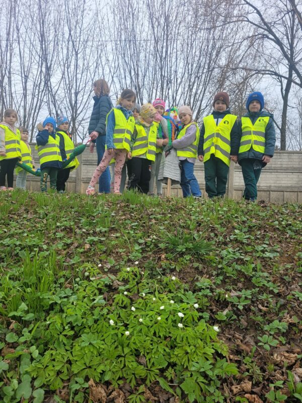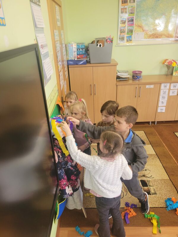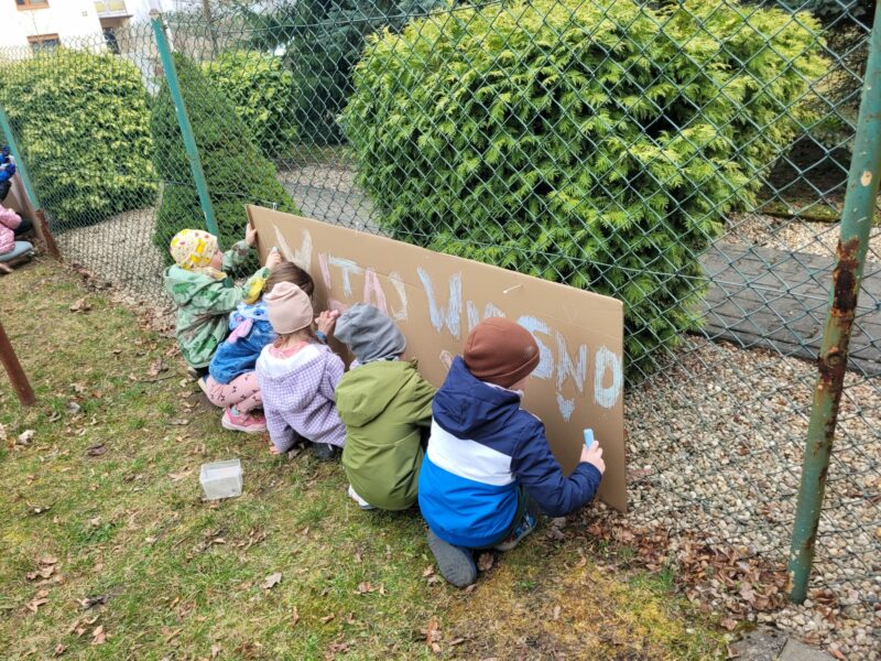 Uśmiechnięci wyruszyliśmy na spacer w okolicy naszego przedszkola, gdzie pożegnaliśmy zimę wraz z Marzanną, a przy okazji poszukać zwiastunów wiosny, o których rozmawialiśmy na zajęciach. Dodatkowo dzieci próbowały odstraszyć zimę, śpiewając głośno piosenki o wiośnie. I tak kolorowy, ale już wiosenny, uśmiechnięty pochód mógł wrócić do przedszkola, gdzie dzieci wykonały banery na powitanie nowej pory roku. Mamy nadzieję, że dzięki zaangażowaniu naszych przedszkolaków wiosna zawita do nas na dobre, a wraz z nią ciepłe dni, z których będziemy czerpać radość.