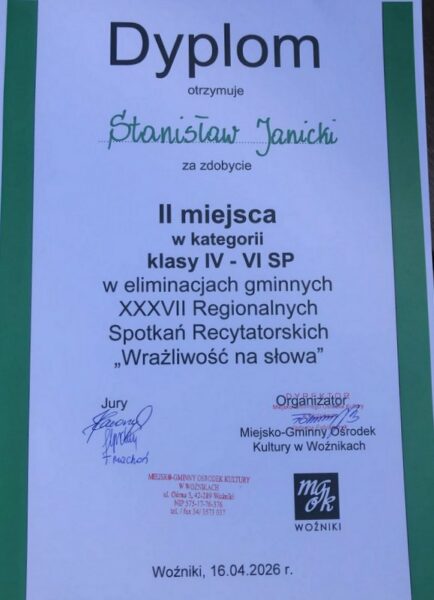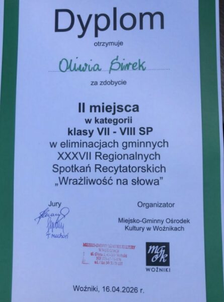 16 kwietnia w Miejsko-Gminnym Ośrodku Kultury w Woźnikach odbyły się gminne eliminacje XXXVII Regionalnych Spotkań Recytatorskich dla dzieci i młodzieży „Wrażliwość na Słowa”. Naszą szkołę reprezentowało siedmioro uczniów, dwoje z nich zakwalifikowało się do eliminacji powiatowych w Lublińcu.